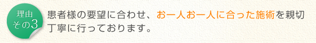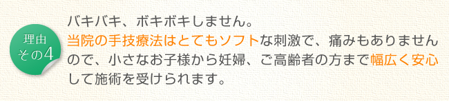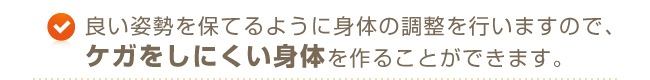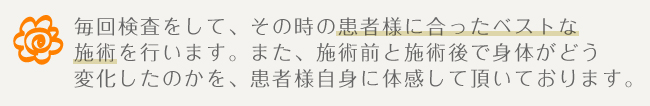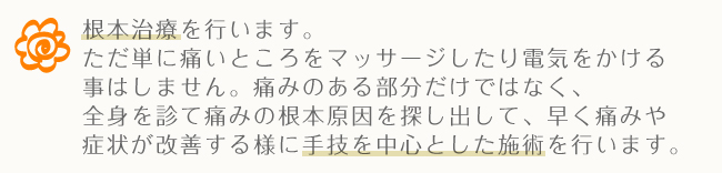 当院では、ただ単に痛いところだけをマッサージしたり、電気をかけるといったその時だけ気持ちがいい施術とは違い、全身を診て症状の根本原因を探し出し、患者様に合ったベストな施術を行うことにより、症状を改善していきます。又当院では、「症状がなくなったらそれで終わり」ではなく、日常生活に戻っても再びつらい症状を出さないためには、予防がとても重要と考えています。その1つの施策として、健康な状態を維持するために「セルフケア」例えば、正しい姿勢や身体の使い方、自宅でできる簡単な運動やストレッチ等の指導を行っております。