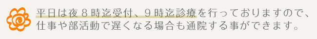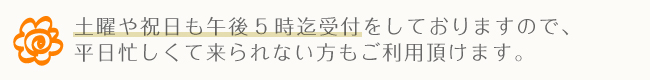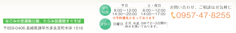 | 休診日 | 日曜日 正月、お盆、GWで2〜3日間の休みを頂いております。 |