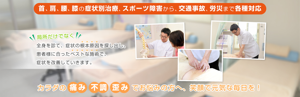 幾多ある整骨院、鍼灸院などの中から当院を選んで来て頂いた患者様とは、何かご縁があると思います。私はそのご縁を大切にしたいと思っております。「ここに来て良かった」「本当に楽になった」と喜んで頂ける様に、1日でも早く症状が改善し、笑顔で元気になれる様に、誠心誠意施術に取り組んで参ります。